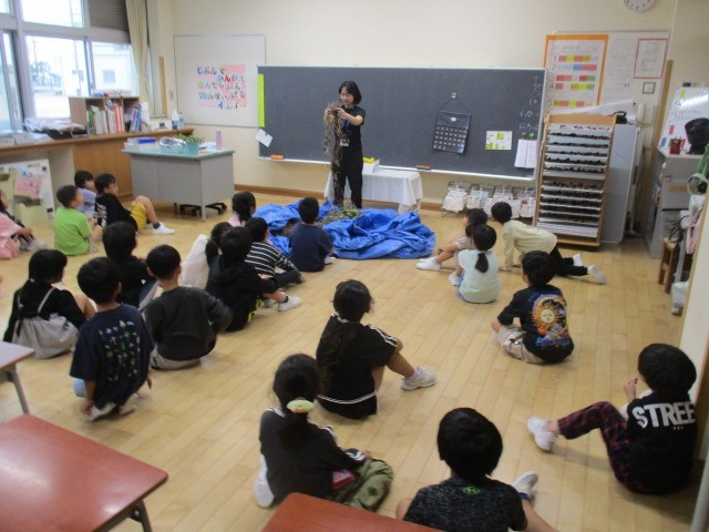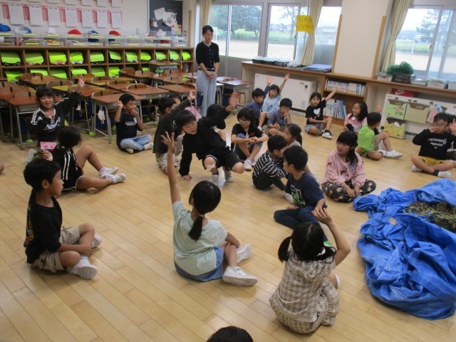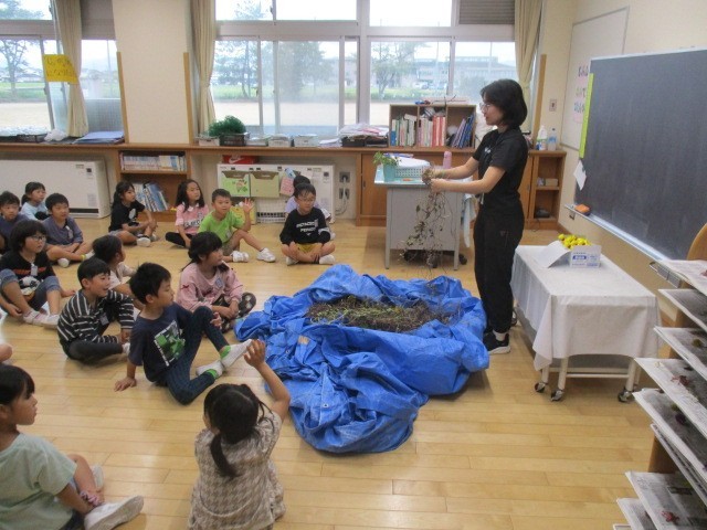1年生の3時間目は、リースづくりの時間でした。自分たちが育ててきたアサガオのつるを使ってリースをつくるみたいです。