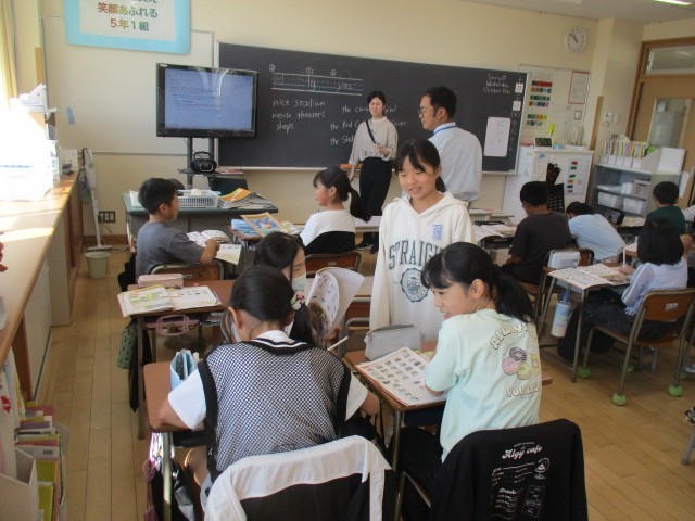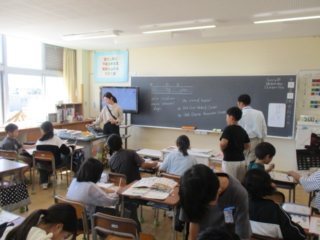 5年1組の3時間目は、外国語科の学習でした。「おすすめのしせつ」を英語で考えていました。