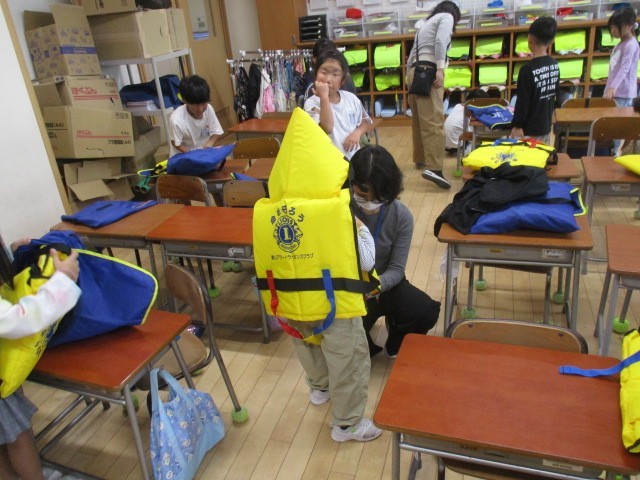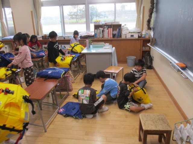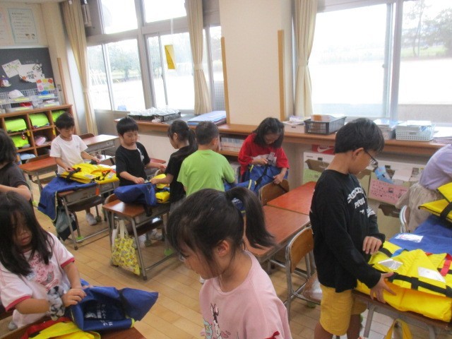 1年生は、1時間目にライフジャケットを着る練習をしていました。着た後に、きれいにたたんでしまうところまで自分で練習していました。