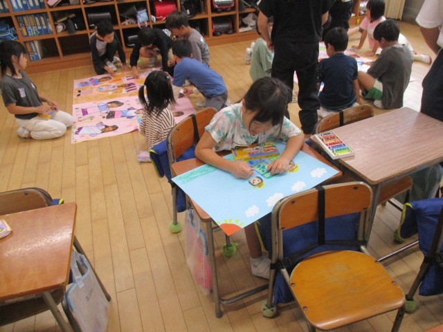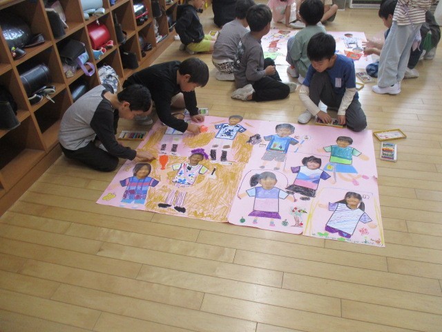 2年生は、1時間目に絵を描いていました。生活科の様子の絵を仕上げた人から、この前描いて自分たちが集合した絵の背景等を描いていました。