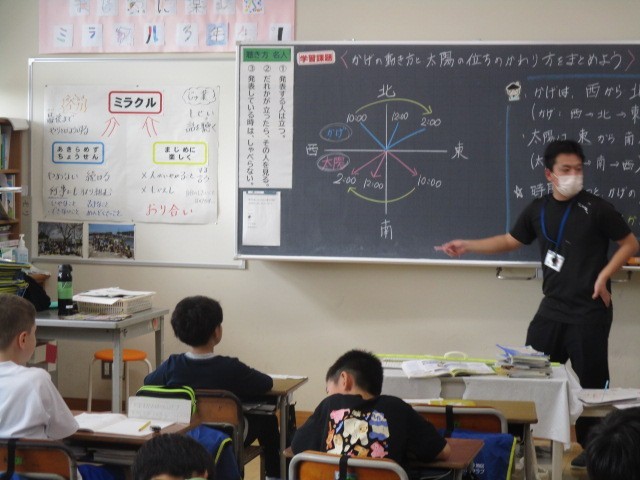 3年生の3時間目は、理科の学習でした。かげの動き方と太陽の位置の関係について考えていました。