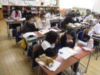 5年1組の3時間目は、外国語科の学習でした。地図を見ながら隣の人に選んだ場所の説明を英語で伝えていました。