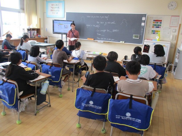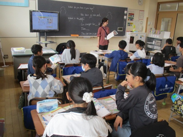 5年1組の3時間目は、外国語科の学習でした。地図を見ながら隣の人に選んだ場所の説明を英語で伝えていました。