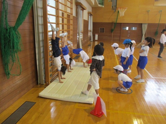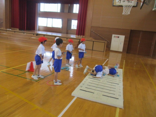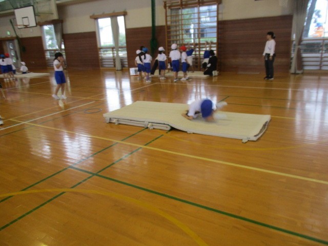 1・2年生の5時間目は、体育科の学習でした。体育館でマット運動をしていました。