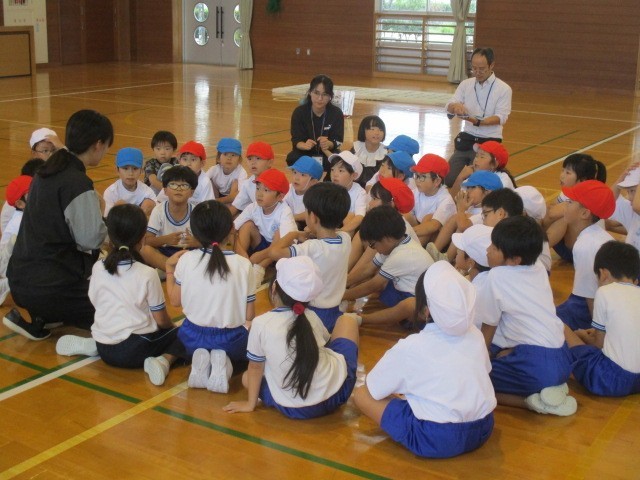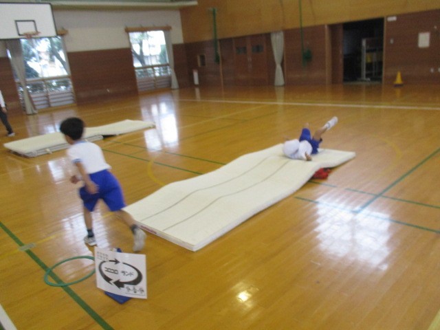5時間目の1・2年生合同体育で、いろいろなコースを使ってマット運動の「わざ」の練習をしました。