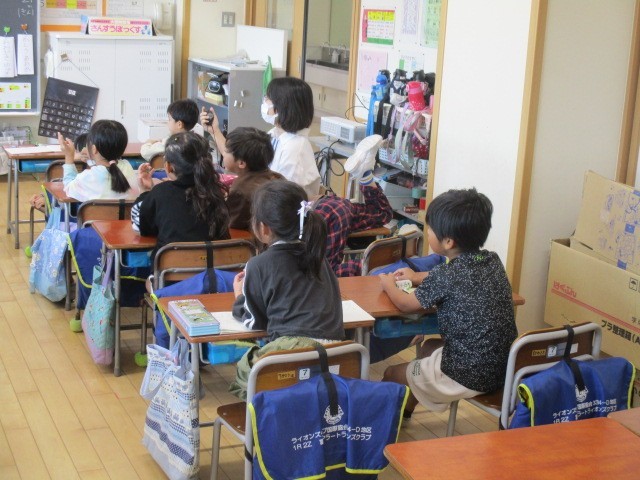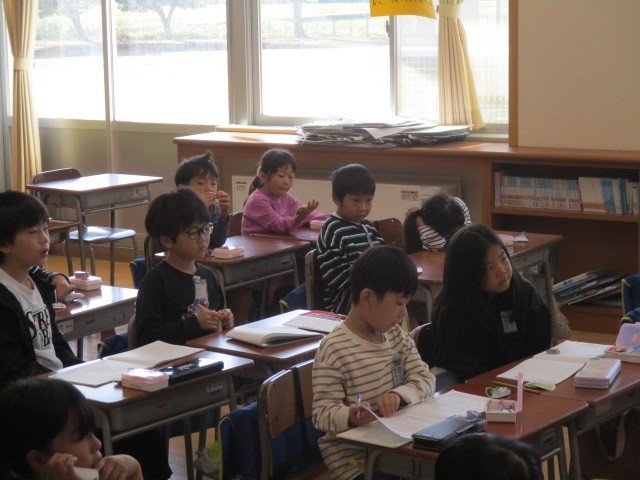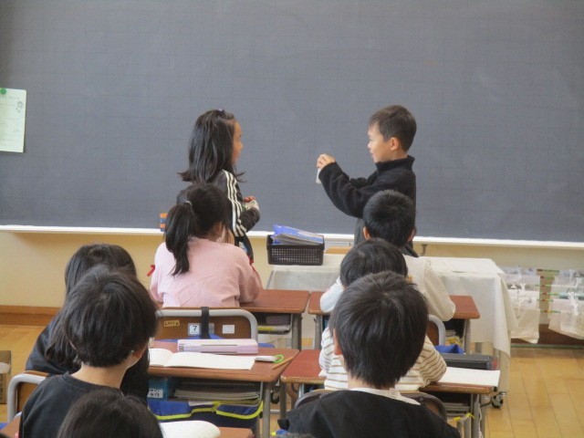 1年生の1時間目は、算数科の学習でした。「8+9は」「17」計算カードを使って、ペアで交互に問題出して答えていました。