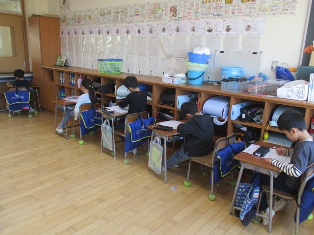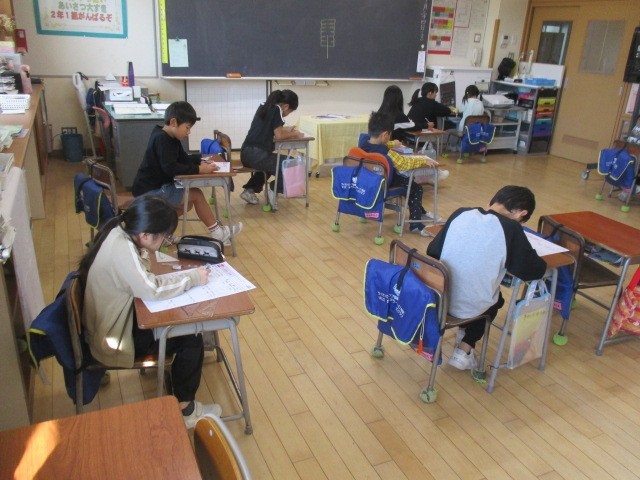 2年生の1時間目は、算数科の学習でした。「長方形と正方形」のテストをしていました。
