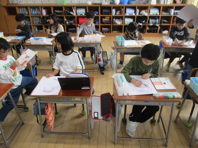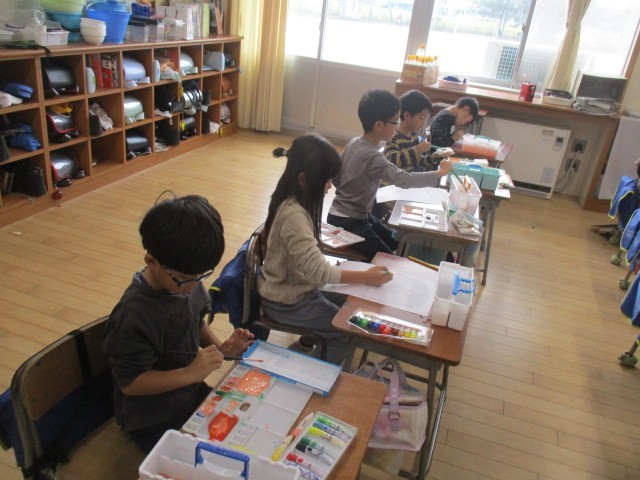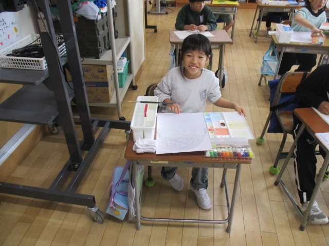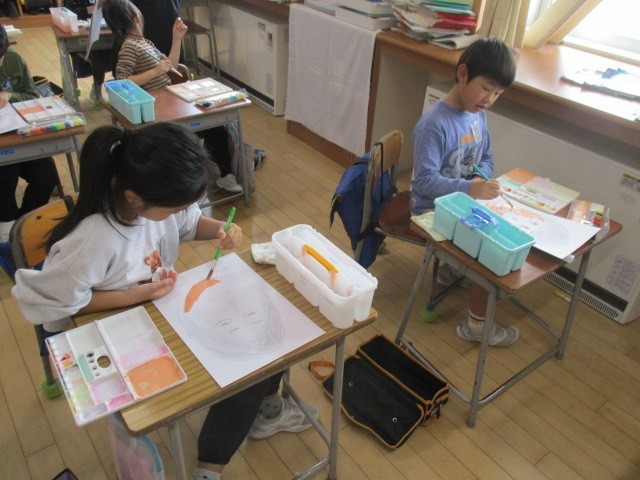 2年生の3時間目は、図画工作科の学習でした。自分の顔に「肌色」を水彩でつくってぬろうとしていました。