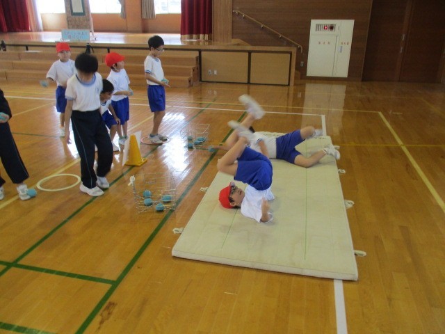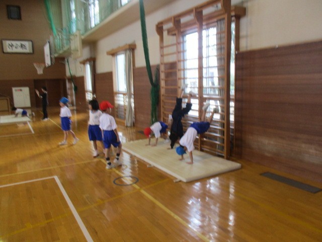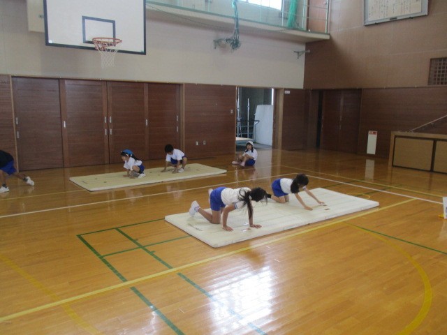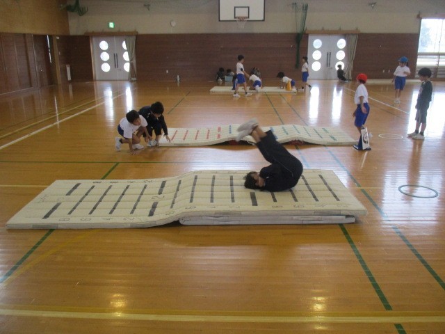 1・2年生は、5時間目に体育館でマット運動をしていました。コースにわかれて技の練習をしていました。