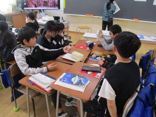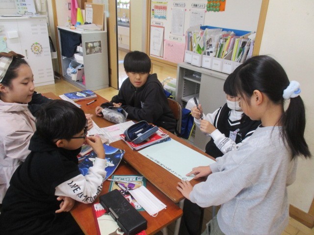 5年2組の1時間目は、国語科の学習でした。いくつかのテーマを決めて、グループごとに話し合っていました。