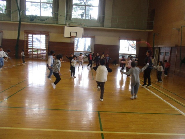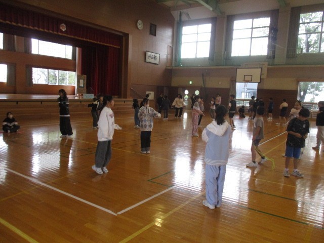 今日のぐんぐんタイムは、グラウンドがぬれていたので体育館で縄跳びでした。1・5年生の様子です。