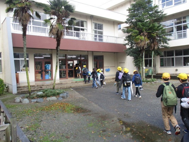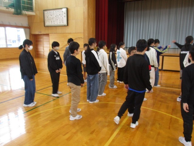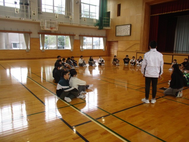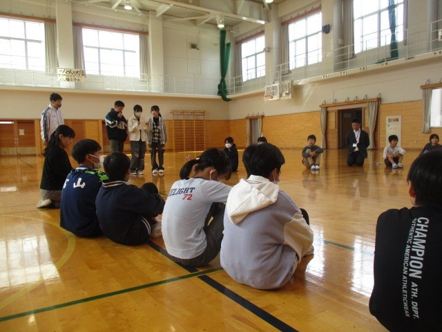 八幡小学校でバスを降りて、体育館で八幡小学校の6年生さんと交流しました。まずは、名前と好きな〇〇や最近はまっている〇〇等、自己紹介をしました。