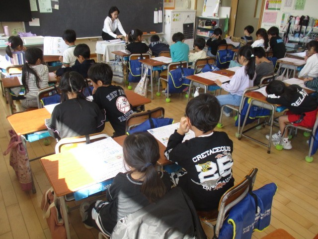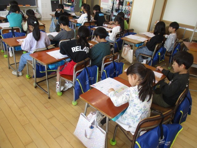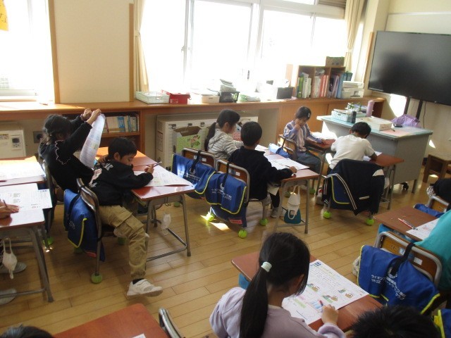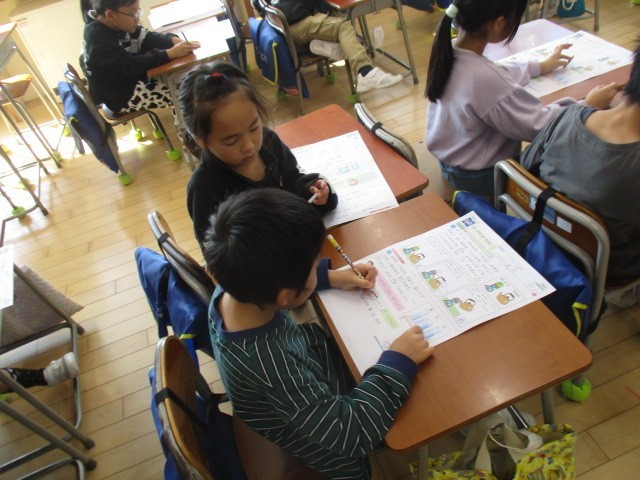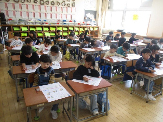 1年生の3時間目は、算数科の学習でした。「どちらがおおい」のテスト直しをしていました。