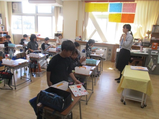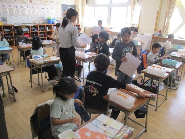 2年生の3時間目は、図画工作科の学習でした。自分の顔の絵に色をぬるところでした。