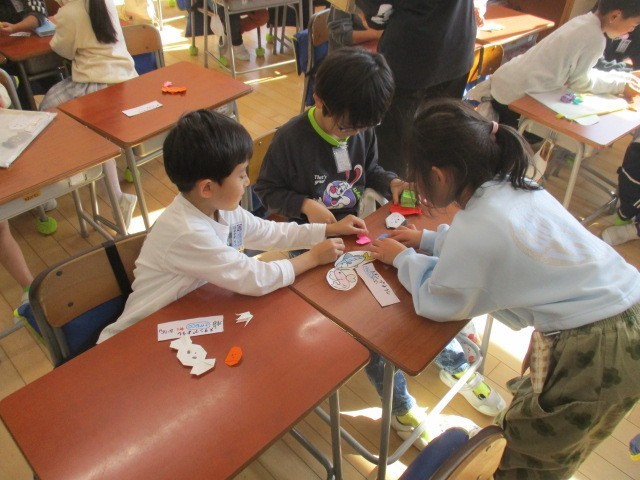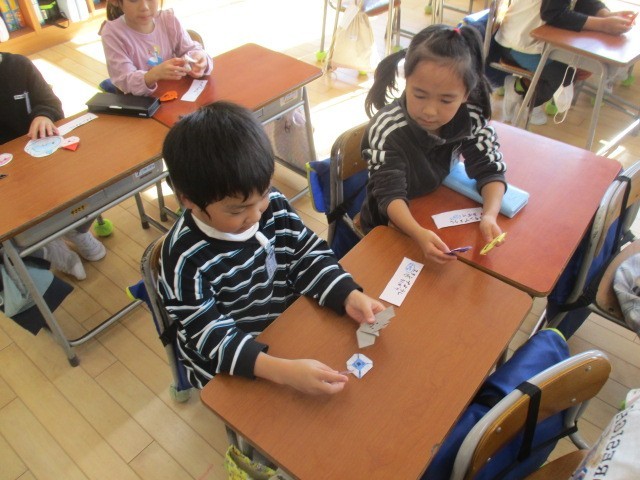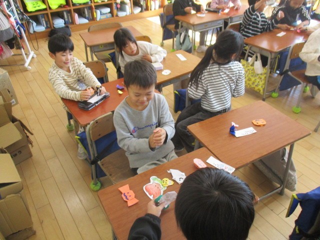 1年生は、5時間目に折り紙でつくったハロウィンのキャラクターが配られていました。これから何かをつくるみたいです。
