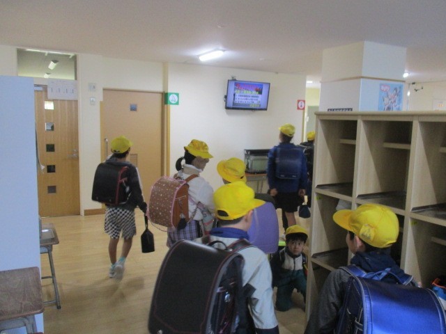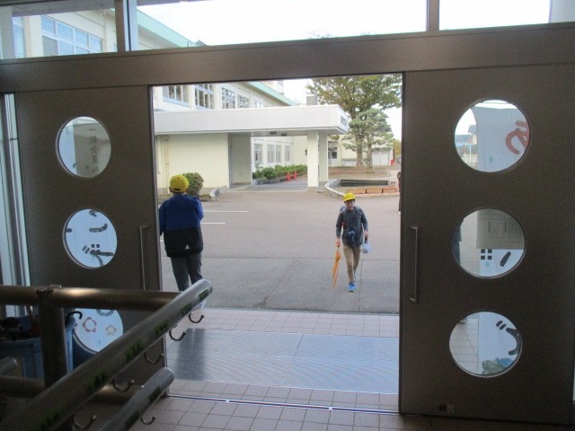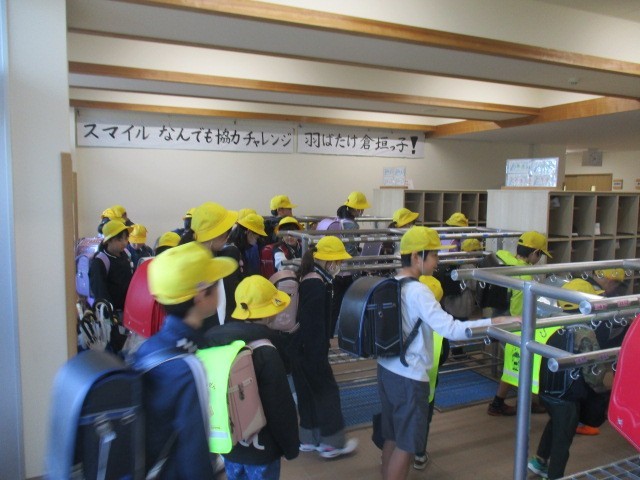 今朝の児童玄関の様子です。曇り空です。子供たちが元気に登校してきました。