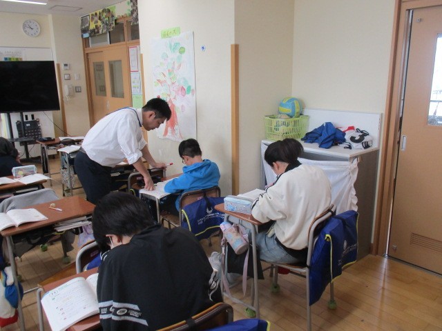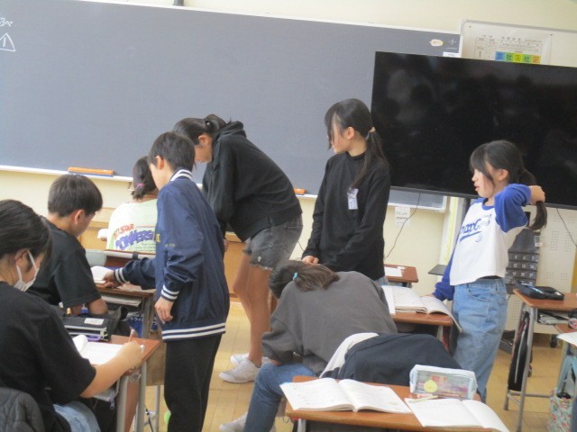 6年生の3時間目は、算数科の学習でした。比例の問題を友達同士で教え合っていました。