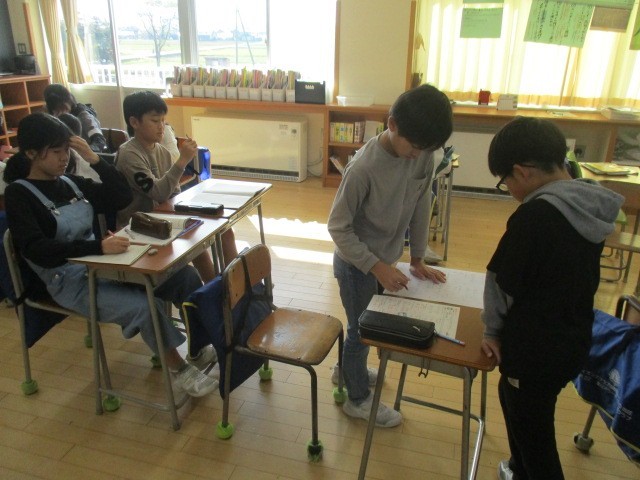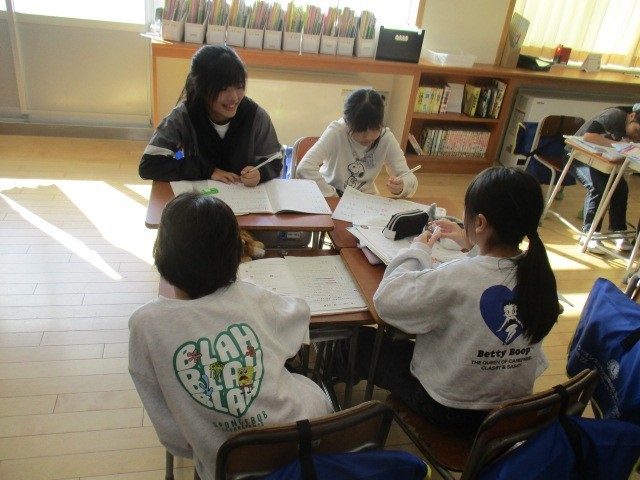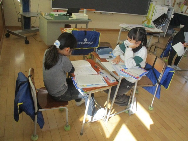 5年2組の3時間目は、算数科の学習でした。分数のたし算とひき算の練習問題を解いていました。