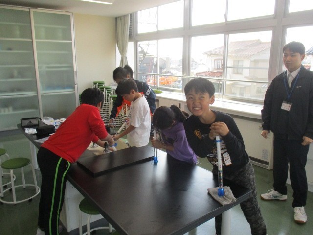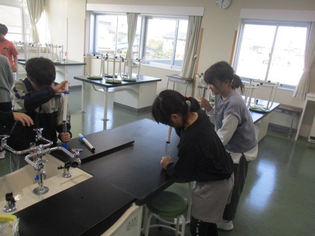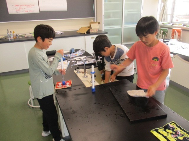 4年生の5時間目は、理科の学習でした。閉じ込めた水をおすことができるか実験していました。