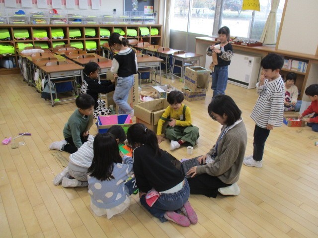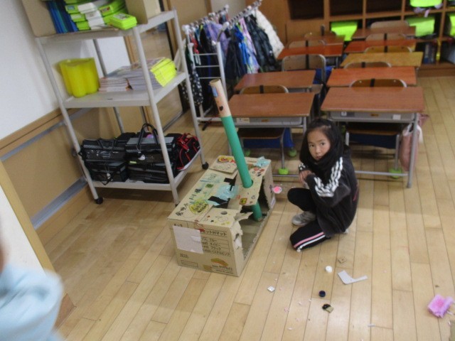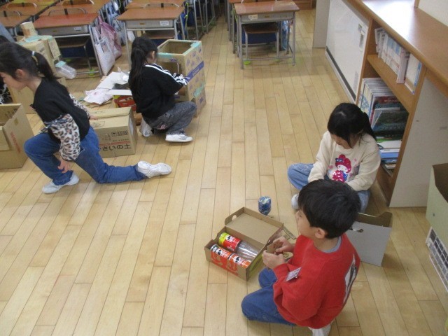 1年生は、3時間目に何かをつくっていました。「みんなのかかりでたのしもう」という活動で、かかりは、「げーむ」「えいが」「パーティー」「おまつり」「クッキング」があるみたいです。