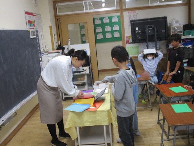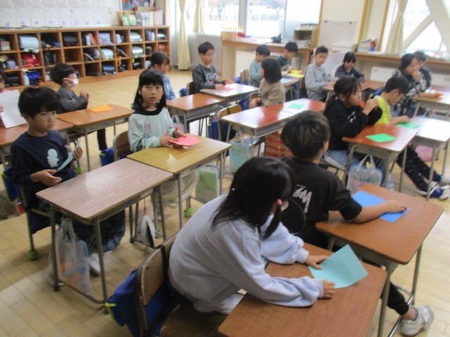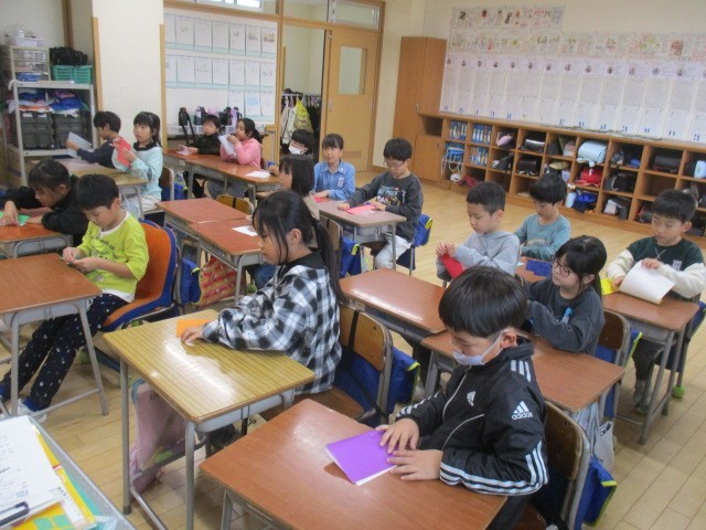2年生は、3時間目におりがみで名札をつくるみたいでした。明日行く予定の校外学習に関する名札みたいです。