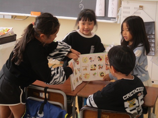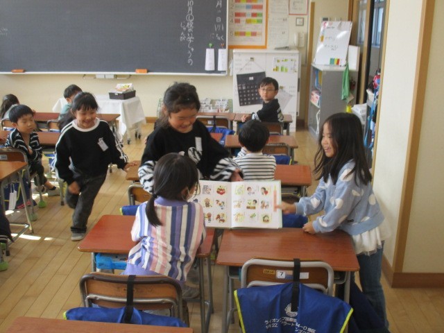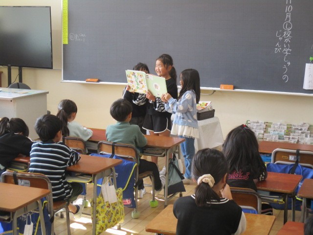 5時間目に1年生教室に行ってみると、3人の子供たちが本の紹介をしていました。「しかがしかられた。」…。だじゃれの本です。