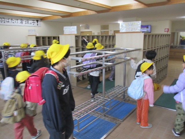 今朝の児童玄関の様子です。晴れです。子供たちの元気な挨拶が響き渡っていました。