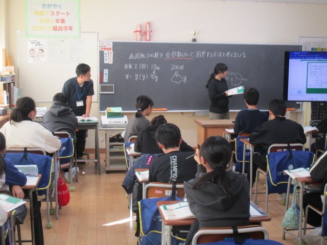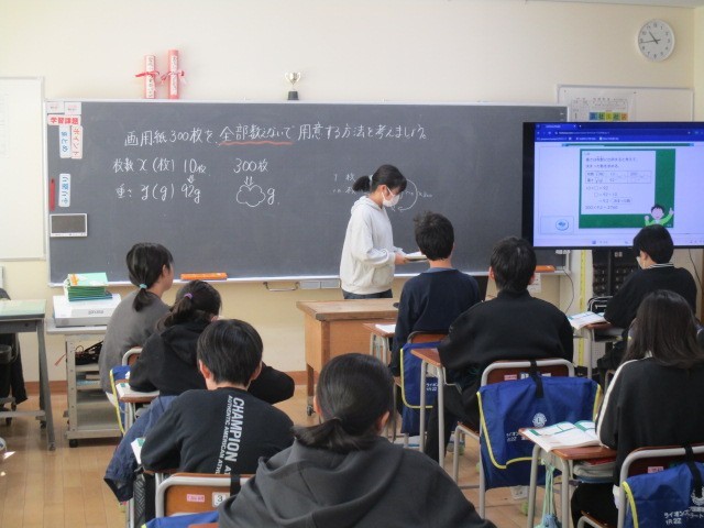6年生の3時間目は、算数科の学習でした。画用紙300枚を数えないで用意する方法について、みんなで考えていました。