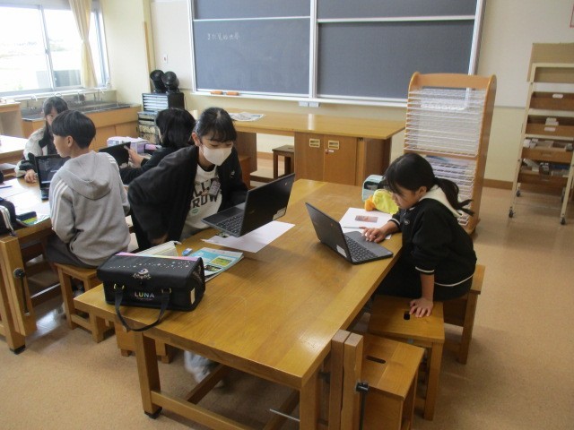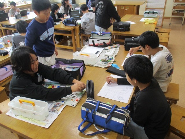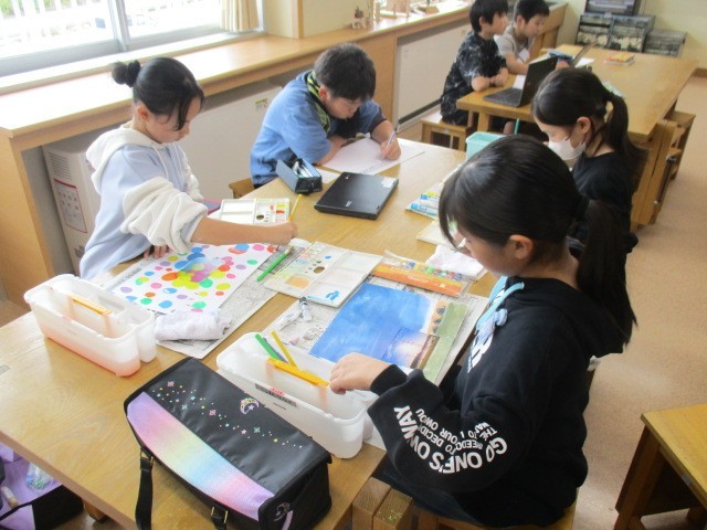 5年1組の5時間目は、図画工作科の学習でした。まだ見ぬ世界というコラージュ作品をつくっていました。