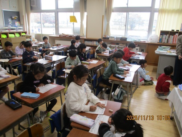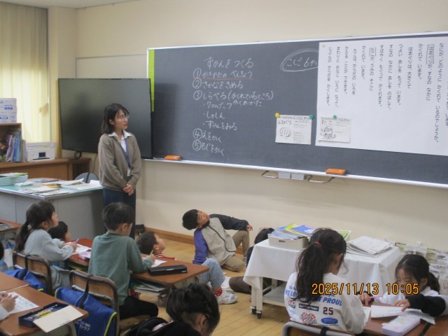11月13日(木)1年生 生き物図鑑づくり 公開日 2025/11/13 更新日 2025/11/13 1年 1年生の2時間目は、国語科の学習でした。魚津水族館で見付けた生き物について、まとめています。
