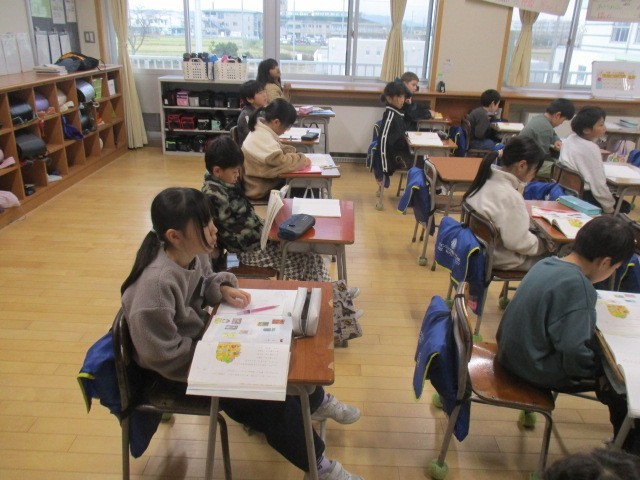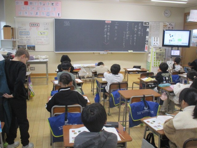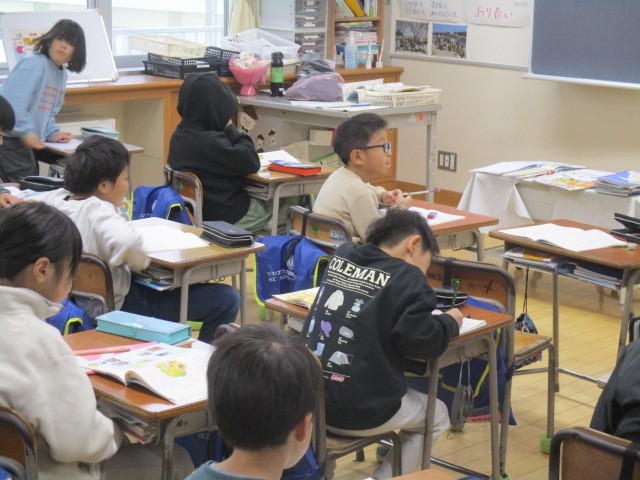 3年生の1時間目は、国語科の学習でした。「3年とうげ」というお話の朗読を聞いていました。
