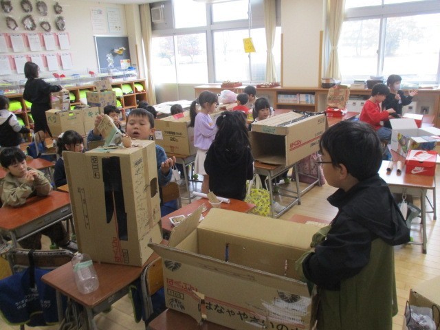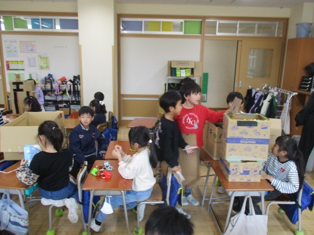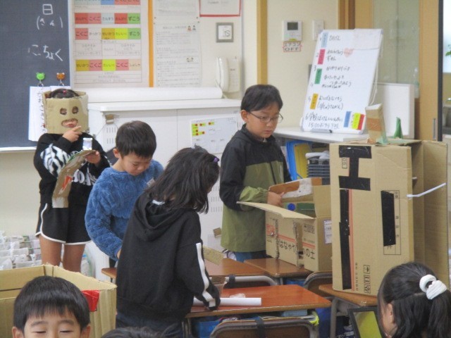 1年生は、3時間目に段ボール等の片付けをしていました。楽しみながら片付けをしている人もたくさんいるようです。