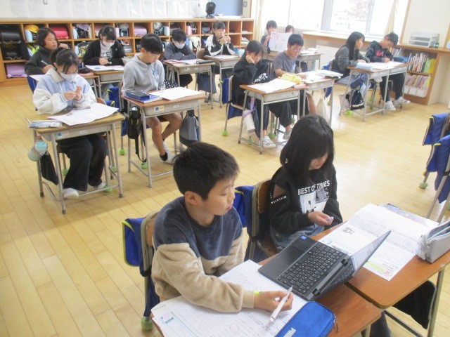 5年1組の3時間目は、国語科の学習でした。テスト直しをしていました。