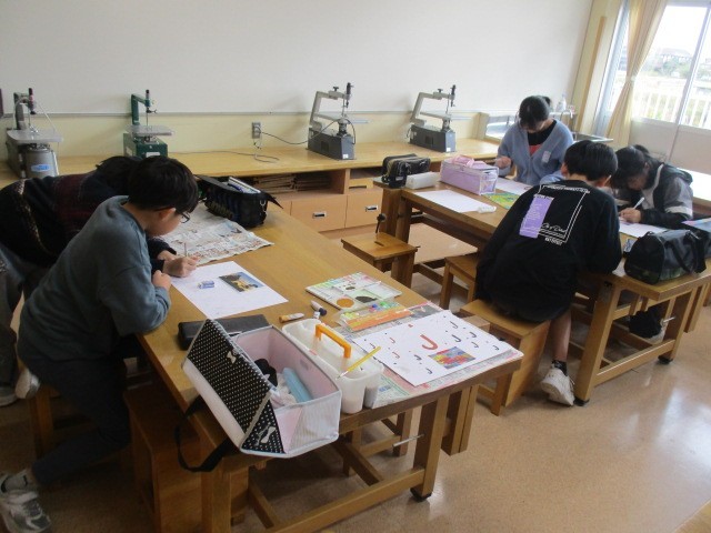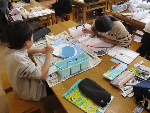 5年2組の3時間目は、図画工作科の学習でした。「まだ見ぬ世界」というコラージュ作品をつくっていました。