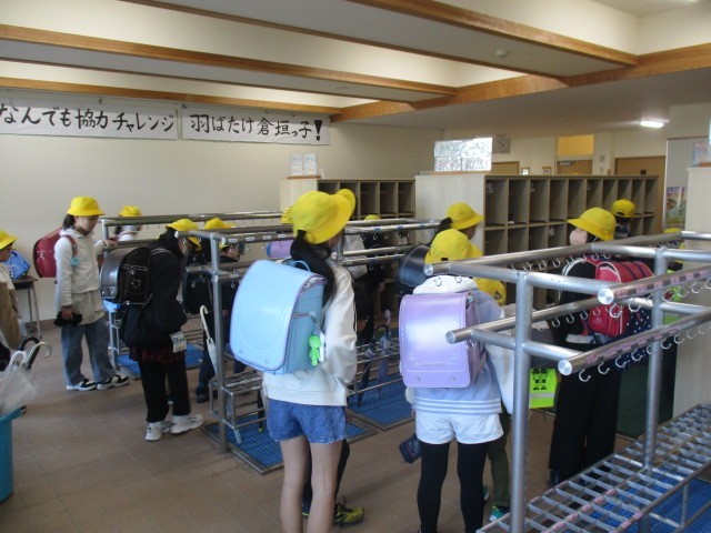 今朝の児童玄関の様子です。日はさしていましたが、肌寒い朝です。子供たちの挨拶は、元気です。