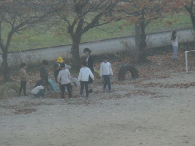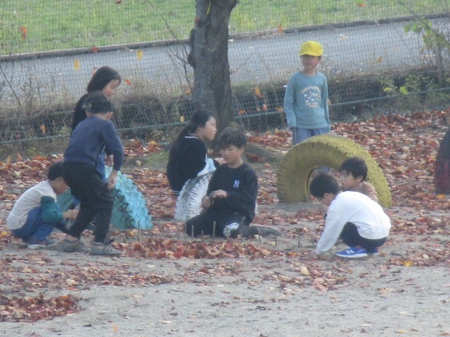 2年生の3時間目は、生活科の学習でした。グラウンドに出て、「秋見付け」をしているみたいでした。