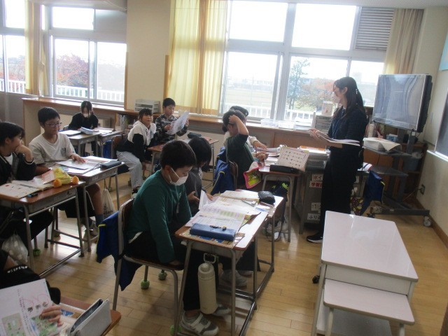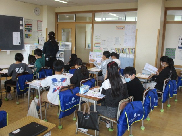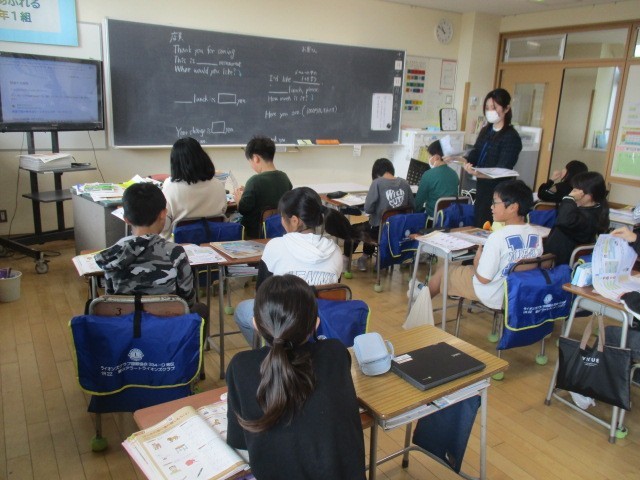 5年1組の3時間目は、外国語科の学習でした。お店に入った時のやり取りについて、英語で考えていました。