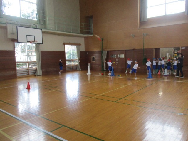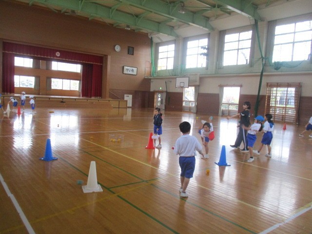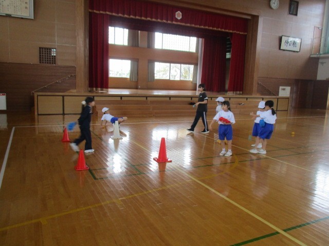 1年生の1時間目は、体育科の学習でした。体育館でいろいろな「投げる」活動をしていました。