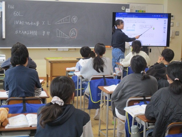 6年生の3時間目は、算数科の学習でした。60Lの水槽に1分あたりに入れる水の量と時間の関係について考えていました。