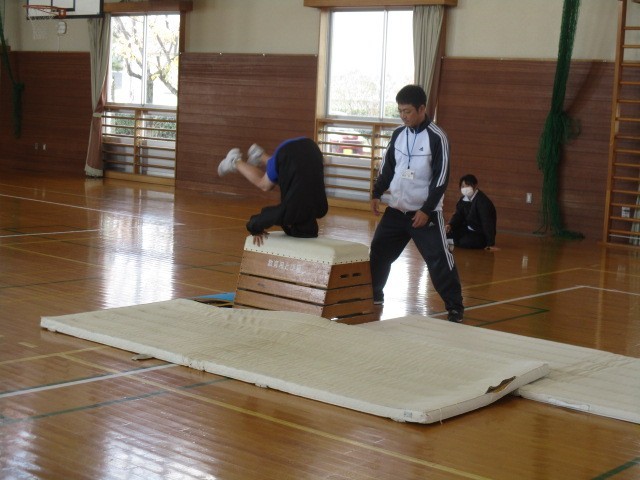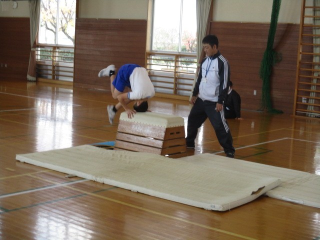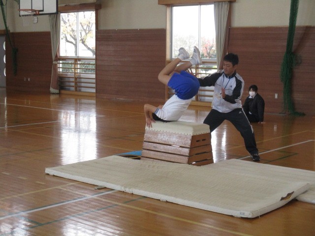 6年生の3時間目は、体育科の学習でした。体育館でとび箱運動をしていました。ちょうど、台上前転の練習をしているところでした。