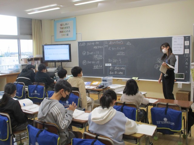 5年生の2時間目は、算数の学習でした。速さと時間を基に距離を求める問題に挑戦していました。公式に当てはめたり線分図に表したりしながら考えていました。