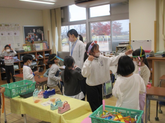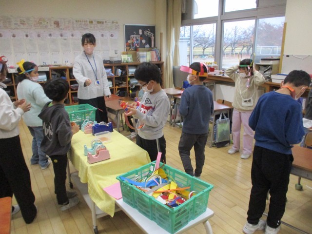 2年生の4時間目は、図工の学習でした。輪っかを組み合わせて、頭や顔に被せて変身していました。