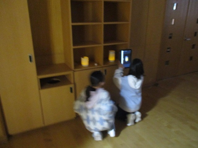 5年1組の3時間目は、図画工作科の学習でした。暗い部屋(音楽室)に行って、自分の作品を撮影していました。
