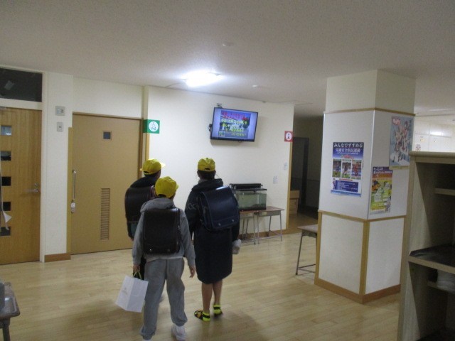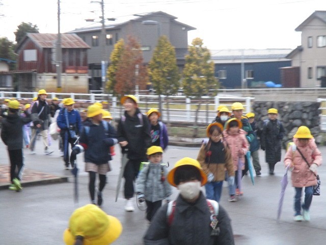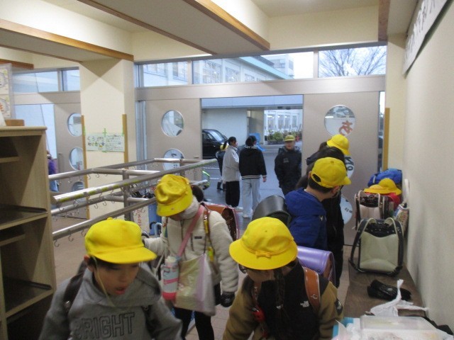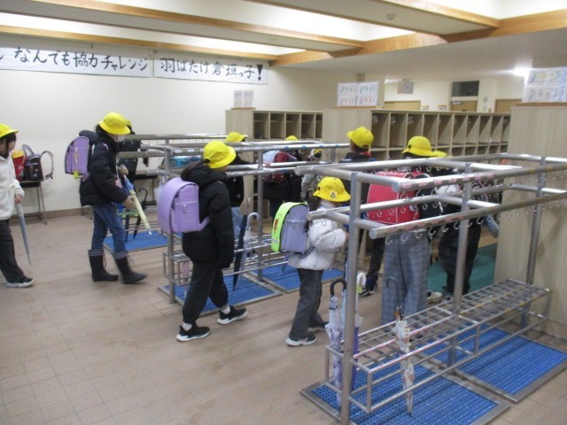 今朝の児童玄関の様子です。雨は、あがっていましたが寒い朝です。子供たちの挨拶は、元気です。