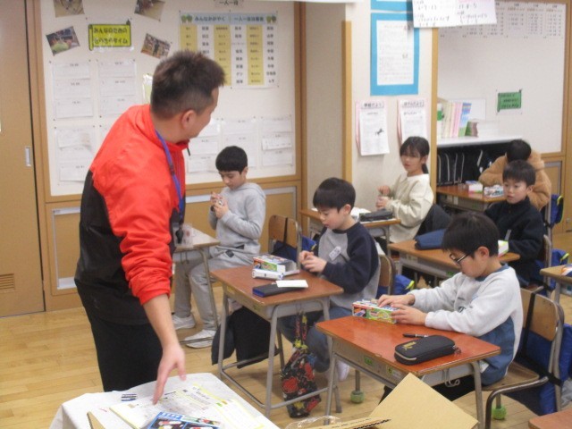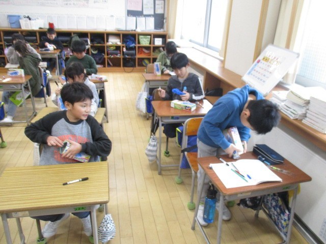 3年生の5時間目は、理科の学習でした。電球の入った箱が配られ、みんな楽しそうに名前を書いていました。