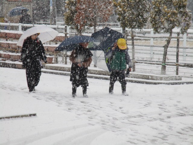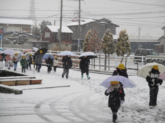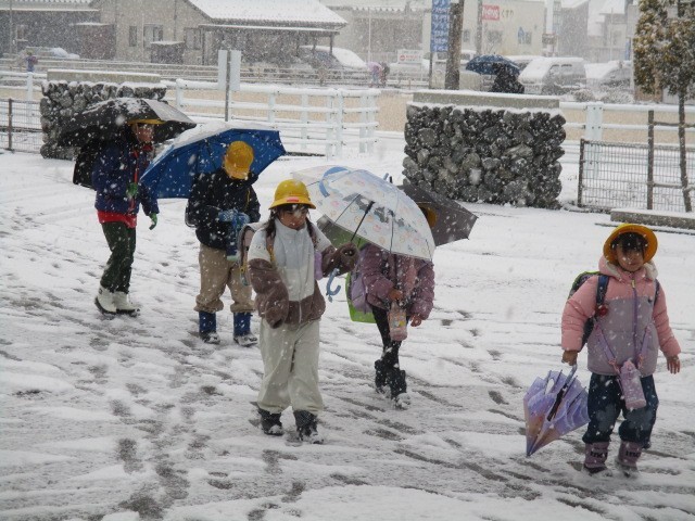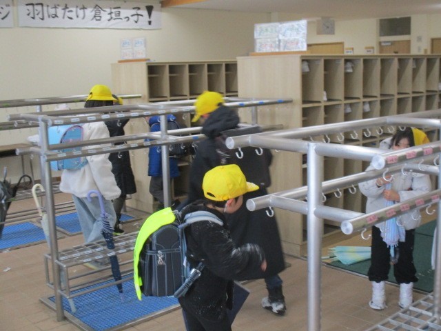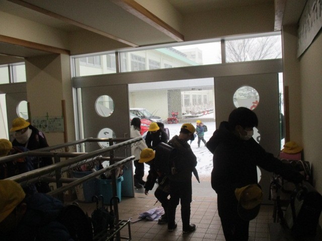 今朝の児童玄関の様子です。雪です。スキー場に雪が積もるのはうれしいですが、あまり降り続くのも…。明日、スキー学習ができますように…。子供たちが元気に登校してきました。