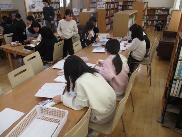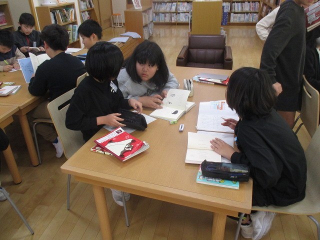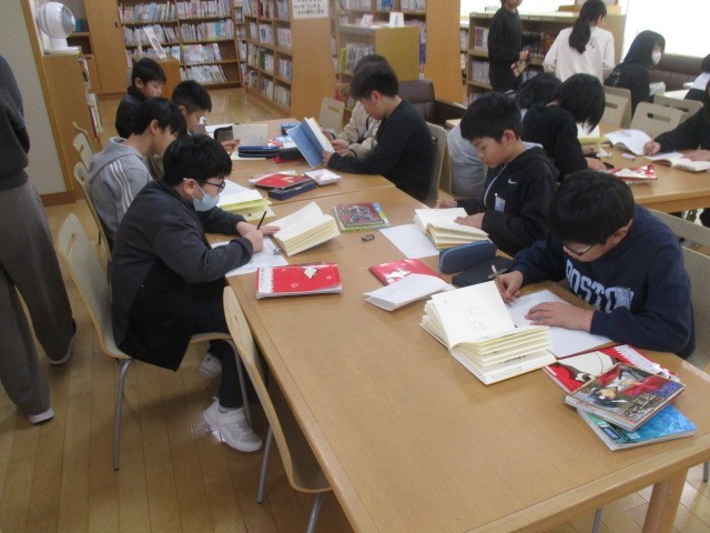 5年1組は、5時間目に図書室にいました。本を選んだあと、詩をかいていました。