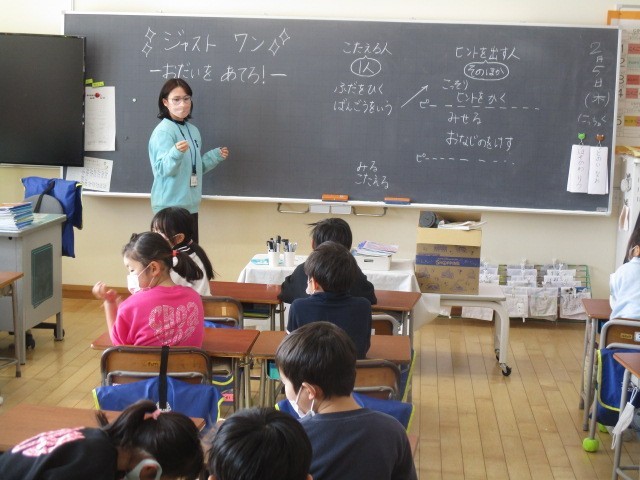 1年生は、5時間目に「ジャストワン」というゲーム?の話をしていました。