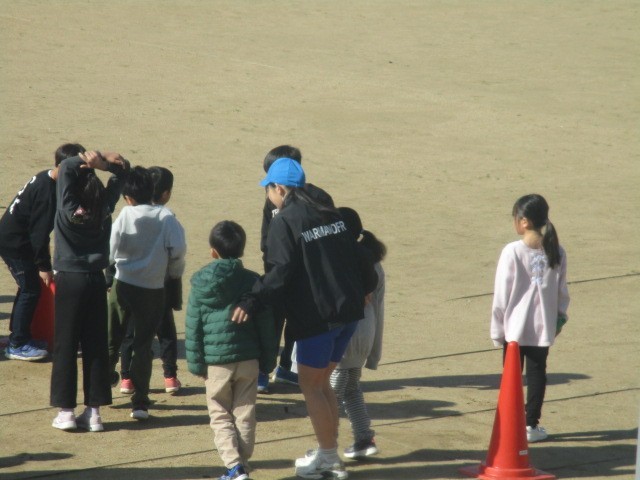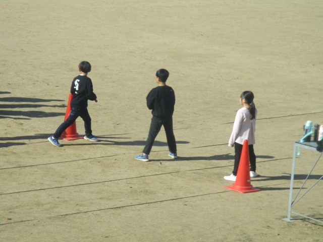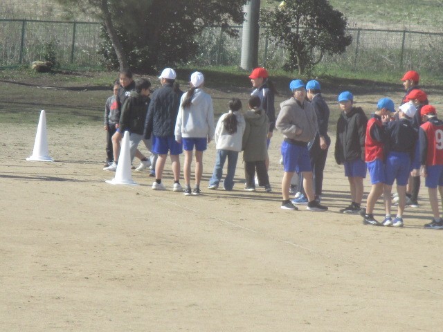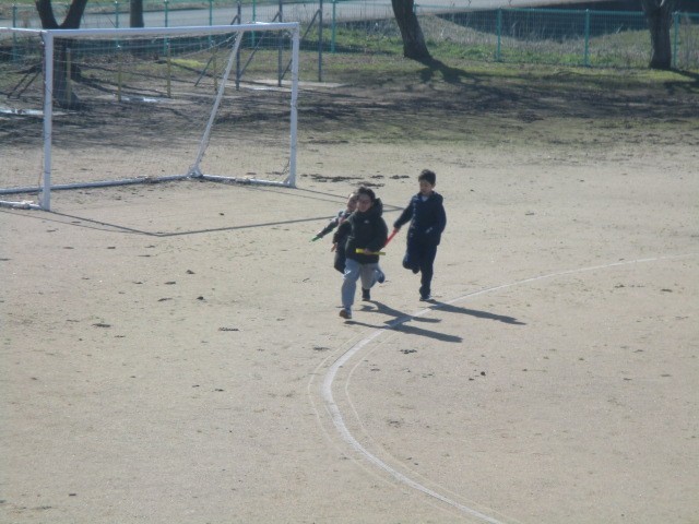 2年生の2時間目は、体育科の学習でした。6年生と一緒にリレーをしていました。