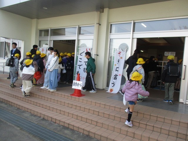今朝の児童玄関の様子です。晴れです。子供たちがたくさん先生方とのお別れにやってきてくれました。今日は、離任式です。